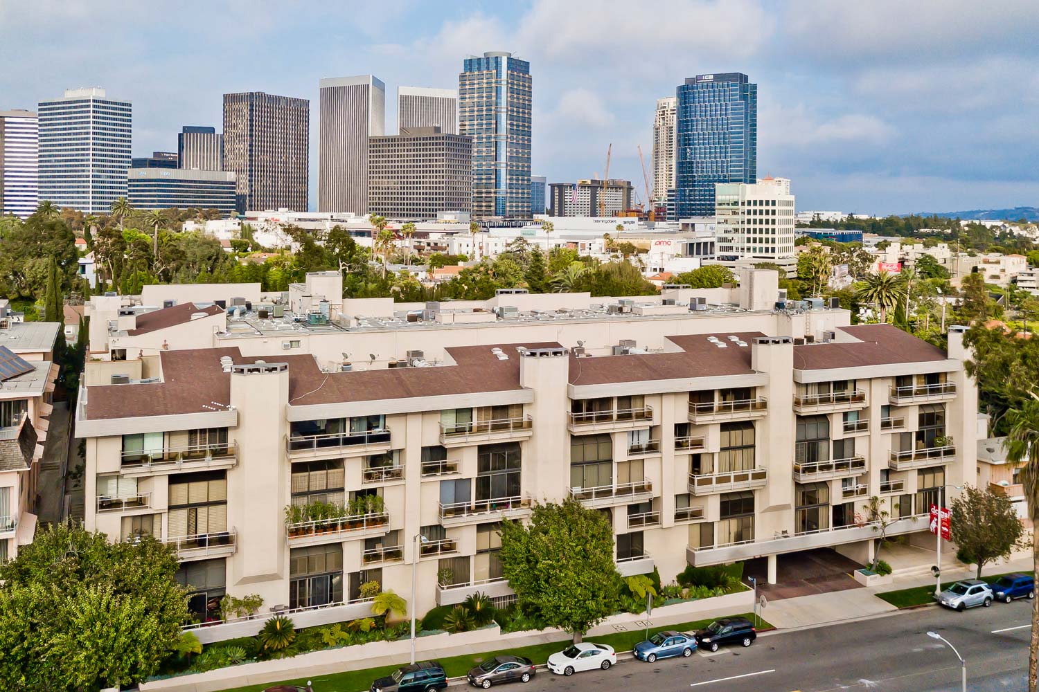 Located just moments from Century City and Beverly Hills this chic and spacious 2,200 +/- sq ft, 2-story, townhouse style condominium offers 2 bedroom suites, 2 ½ baths, and a den/office that could be a 3rd bedroom option. The main level’s living and dining area has a soaring double-height ceiling, fireplace, and a dramatic wall of glass looking out to your private patio and distant tree tops.